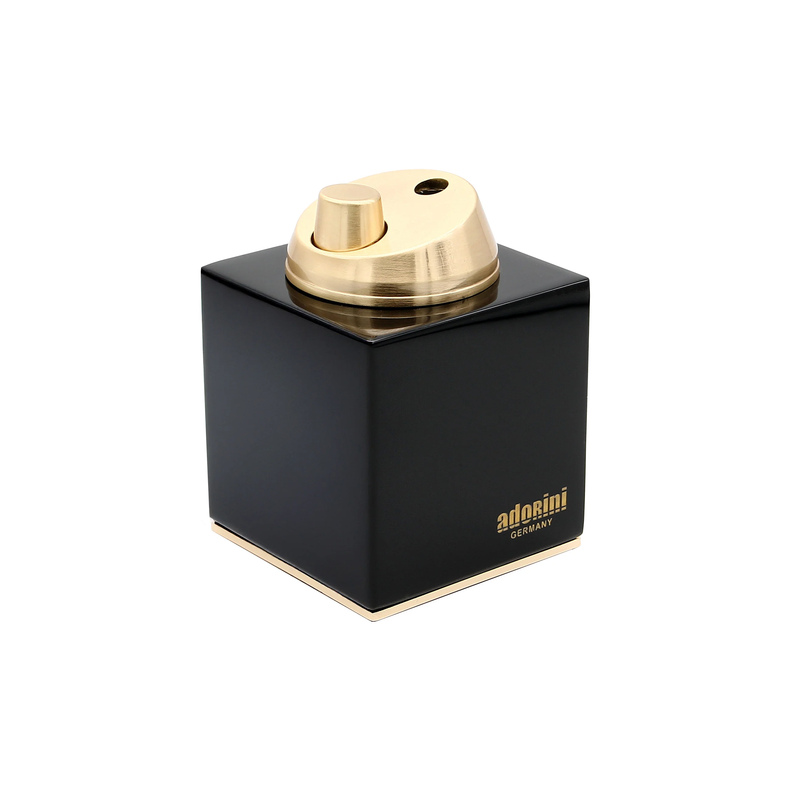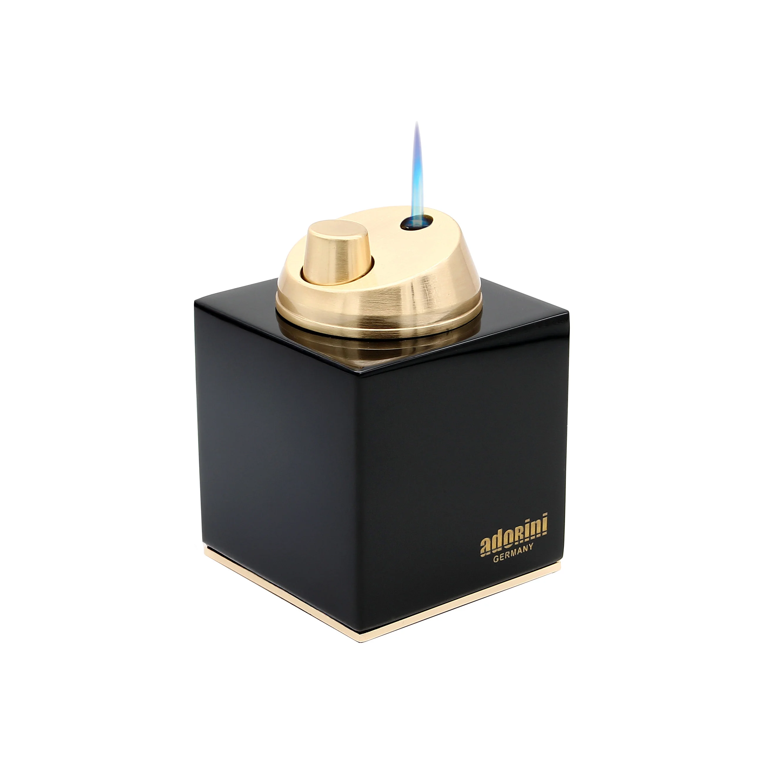 Denne elegante adorini bordlighter med jetflamme kombinerer sofistikeret design med funktionalitet af høj kvalitet. Lighterhuset er lavet af kulsort, højglans lakeret træ og sikrer en imponerende tilstedeværelse, som perfekt fremhæves af den gyldne tænding og den gyldne dekorative kant ved bunden.