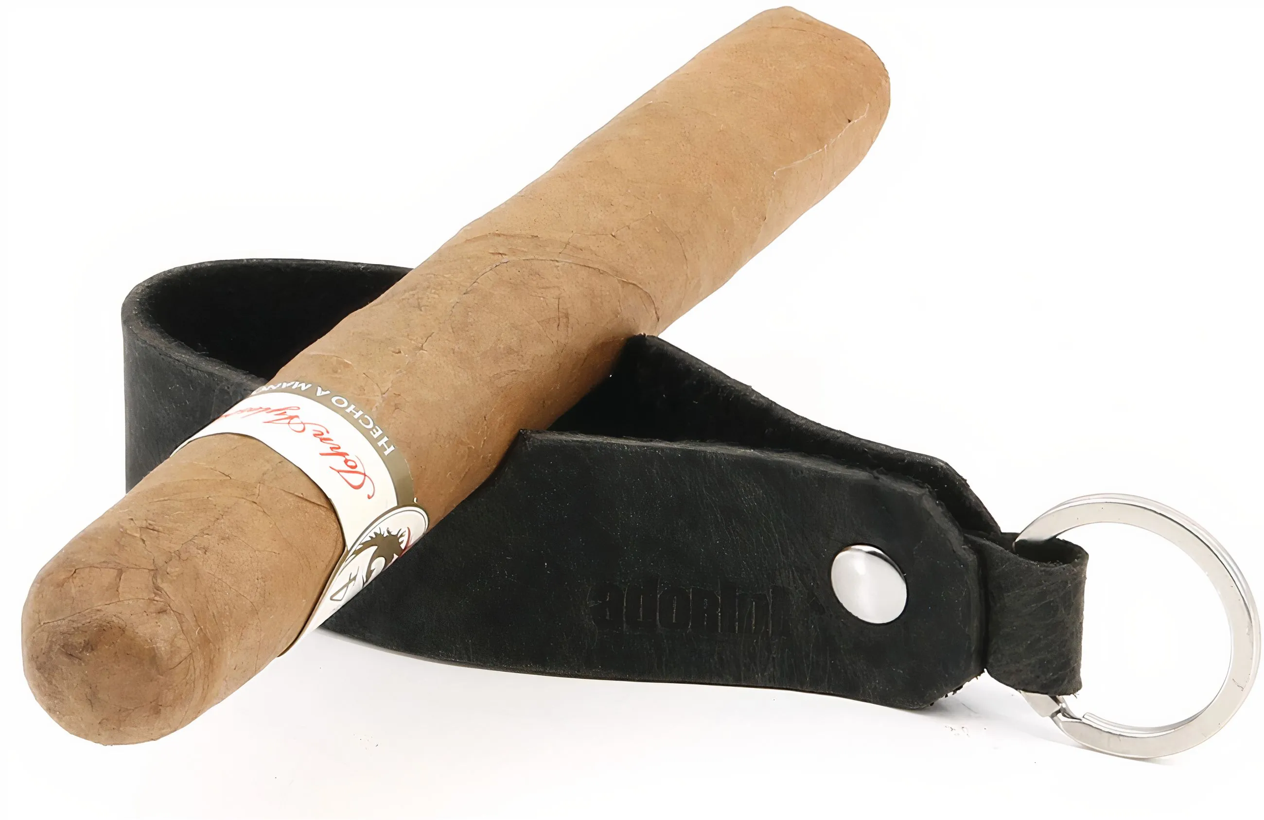 adorini cigar og rørstøtte ægte læder nøglering sort - begrænset oplag Et stilfuldt og praktisk tilbehør til cigar- og pibeelskere: adorini nøgleringen lavet af ægte læder i elegant sort fungerer ikke kun som nøglering, men også som en mobil cigar- og pibestøtte. Især når du er på farten, er der ofte ingen passende måde at lægge en cigar frit fra sig - med denne kloge ledsager har du altid din egen hvile ved hånden. På den ene side er adorini-mærkelogoet stilfuldt præget, mens et ahornblad på den modsatte side giver en særlig accent. Nøgleringen leveres i en attraktiv gaveæske - også ideel som en elegant gave til cigarelskere. Tekniske detaljer: