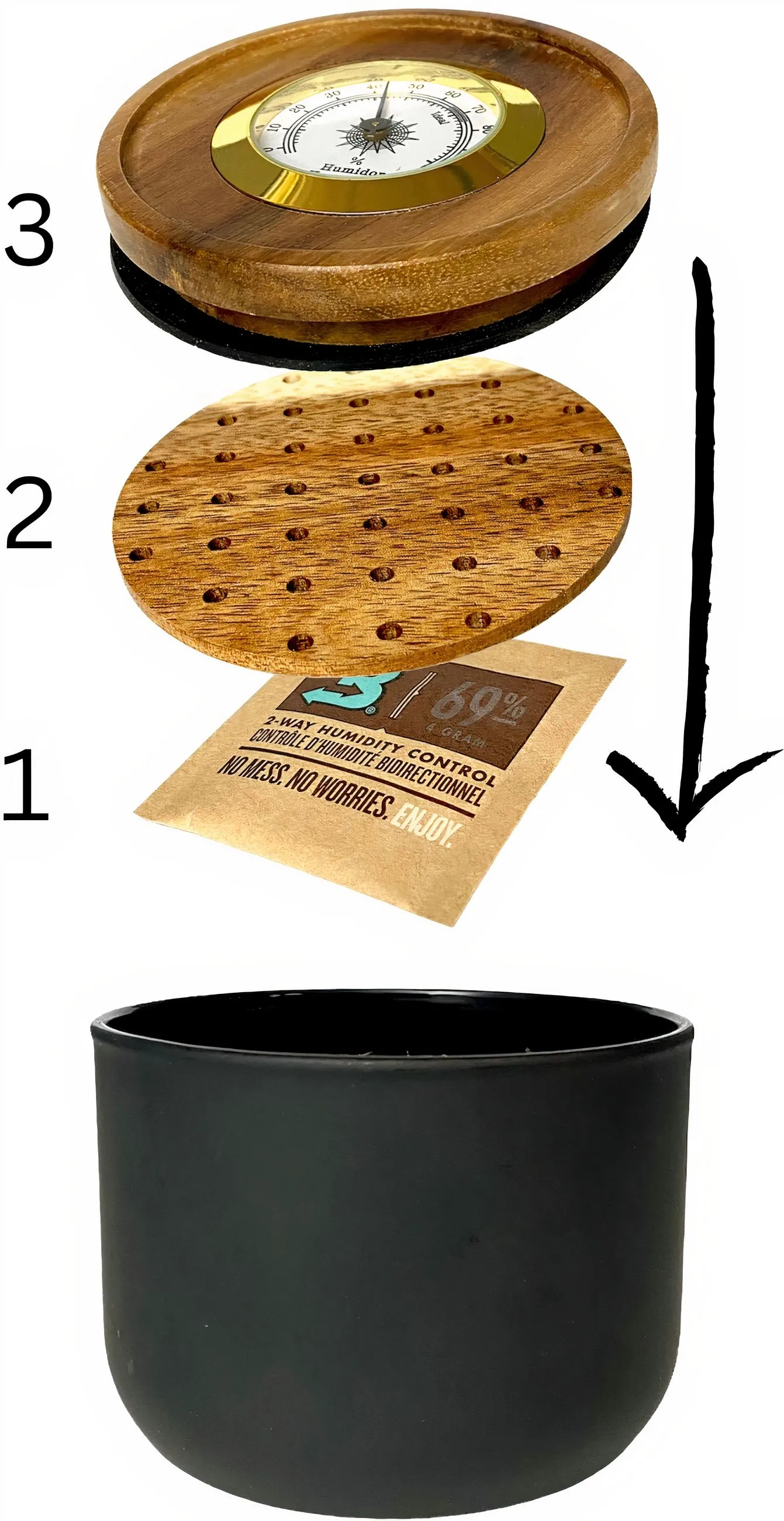 Inde i tobakskrukken er der en rund træhylde, hvorunder vi anbefaler en Boveda-pude til at befugte din tobak