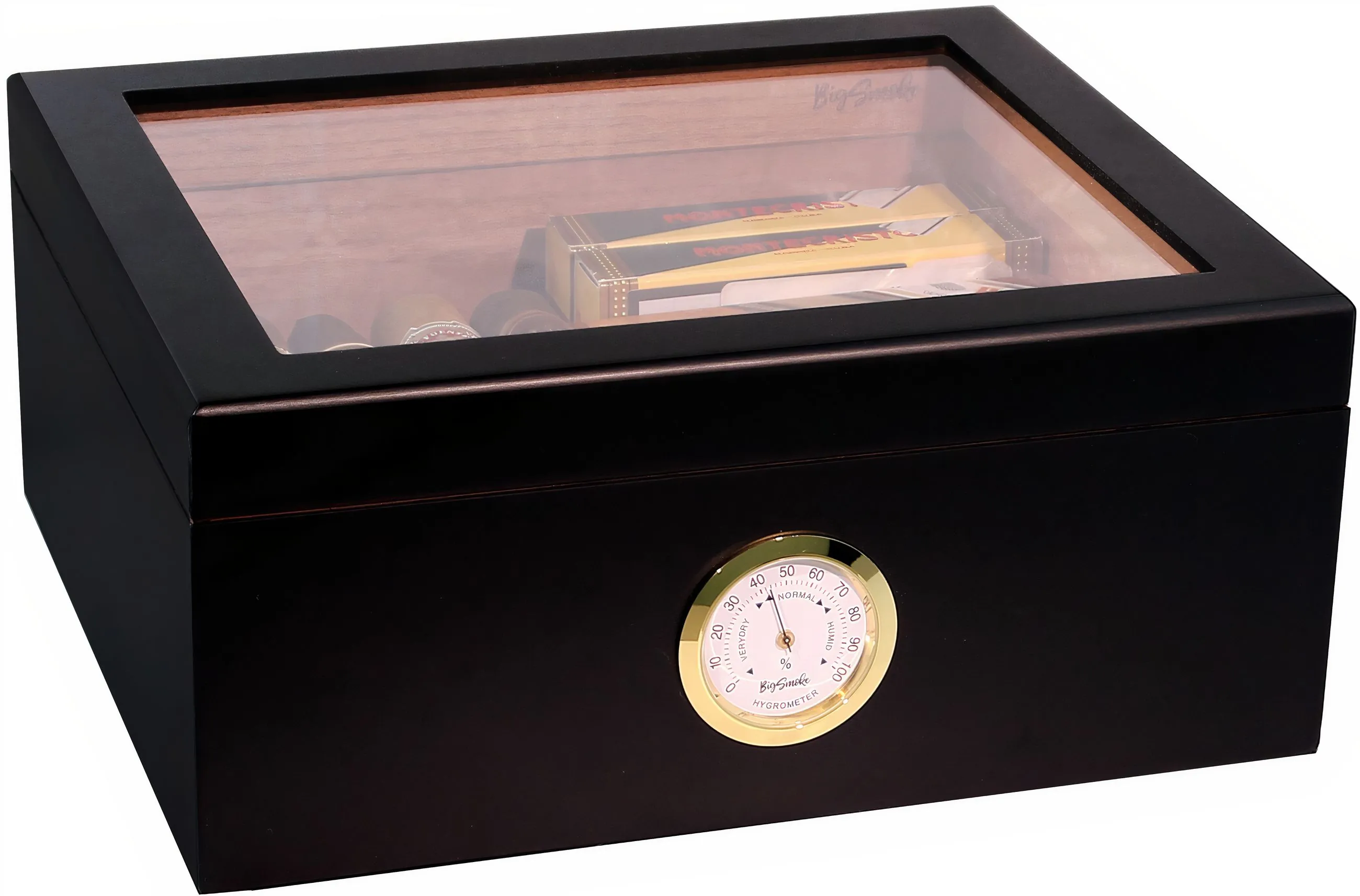 BigSmoke Humidor Medium sort med glaslåg Den elegante humidor fra BigSmoke giver plads nok til dine værdifulde skatte med en anslået kapacitet på omkring 50 cigarer. Selv mindre cigaræsker kan sagtens finde deres plads. Humidorens elegante matte finish suppleres af et glaslåg, der giver et udsyn til interiøret uden at skulle åbne humidoren. Et analogt hygrometer baseret på en metalspiral er indlejret i fronten og er let at aflæse hele tiden. Den medfølgende stangbefugter arbejder på basis af akrylpolymerkrystaller og sikrer et konstant fugtniveau. En lodret skillevæg muliggør fleksibel opdeling og organisering af interiøret. For at beskytte møblerne, som humidoren er placeret på, er bunden dækket af filt.