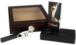 - **Sæt:** Ud over humidoren indeholder sættet et matsort cigaraskebæger med cigarstøtte og en oval cigarklipper i rustfrit stål, der passer til alle almindelige cigarformater. Der medfølger også en luftfugter og en kort, flersproget brugervejledning.