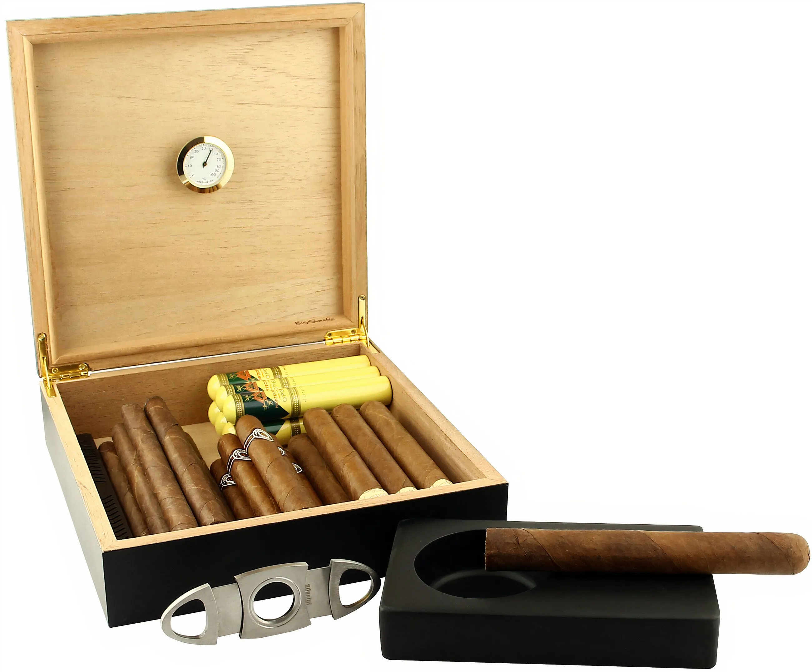 Med BigSmoke Humidor Sæt sort får du en pålidelig ledsager til din personlige cigarfornøjelse - perfekt til dine første skridt eller som en stilfuld tilføjelse til din samling.