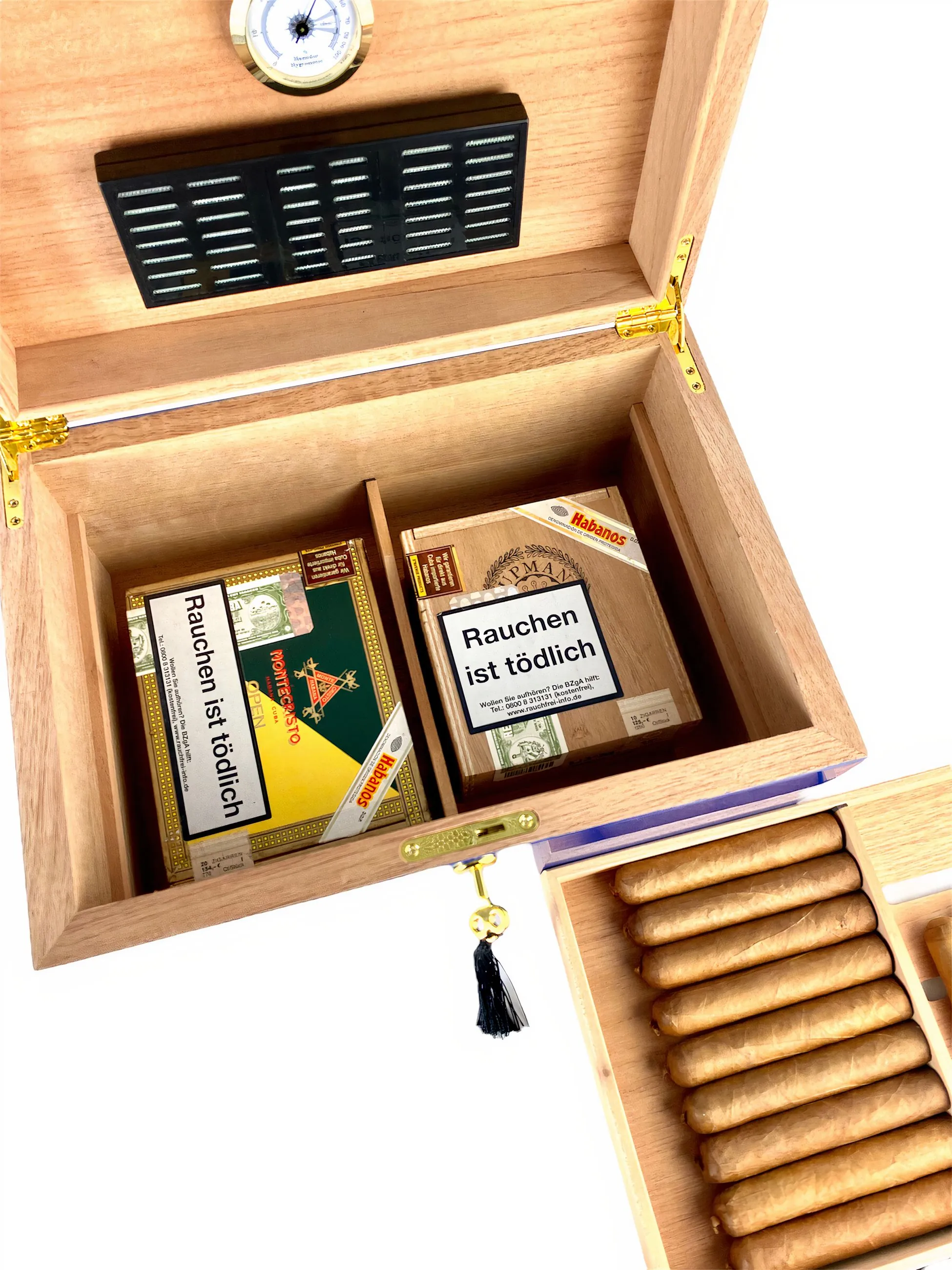 "Cigar Humidor Blue with Cuban Flag for 100 Cigars" er en perfekt symbiose af funktionalitet og elegance, der vil betage både erfarne cigar-connaisseurs og samlere. Forkæl dig selv med denne luksuriøse humidor, og opbevar dine cigarer i en stilfuld beholder, der indfanger essensen af den cubanske cigarverden. Et must-have for enhver cigarentusiast og en gave, der vil blive husket.