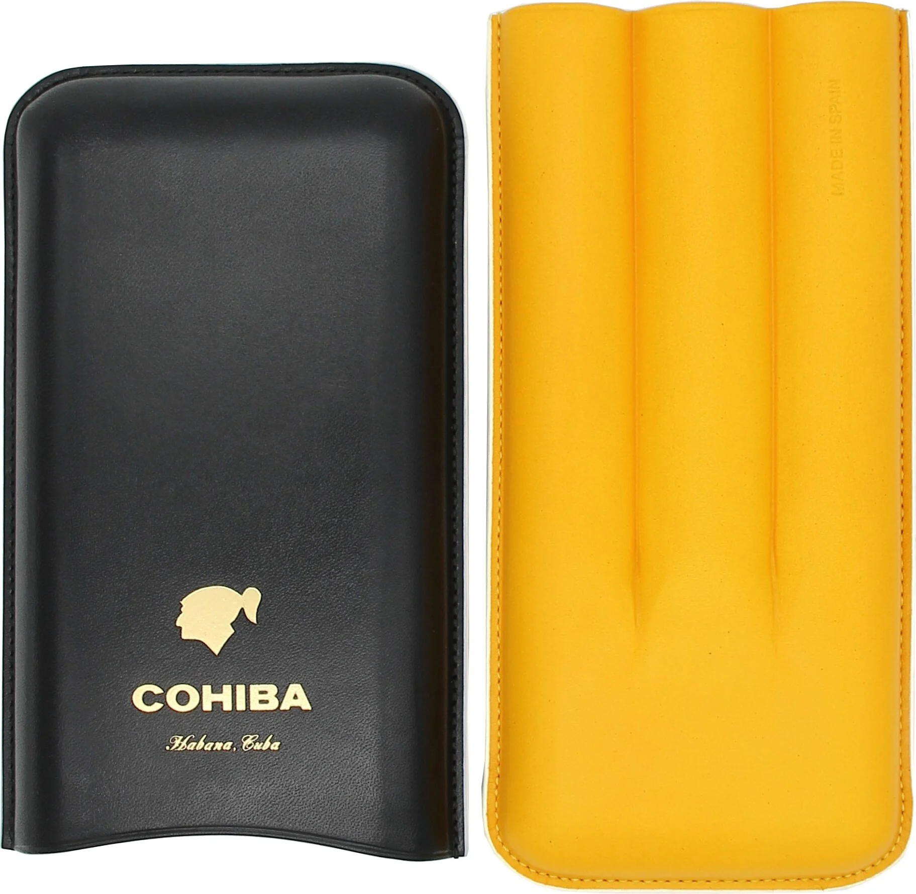The Cohiba cigar case in black, yellow, and white is a sophisticated accessory from Cuba's most famous cigar brand. The iconic combination of black and yellow leather with a white trim evokes the typical Cohiba look and creates a harmonious contrast. The printed Cohiba logo in gold on the front lends the case a high-quality appearance and clearly identifies it as an exclusive branded product.