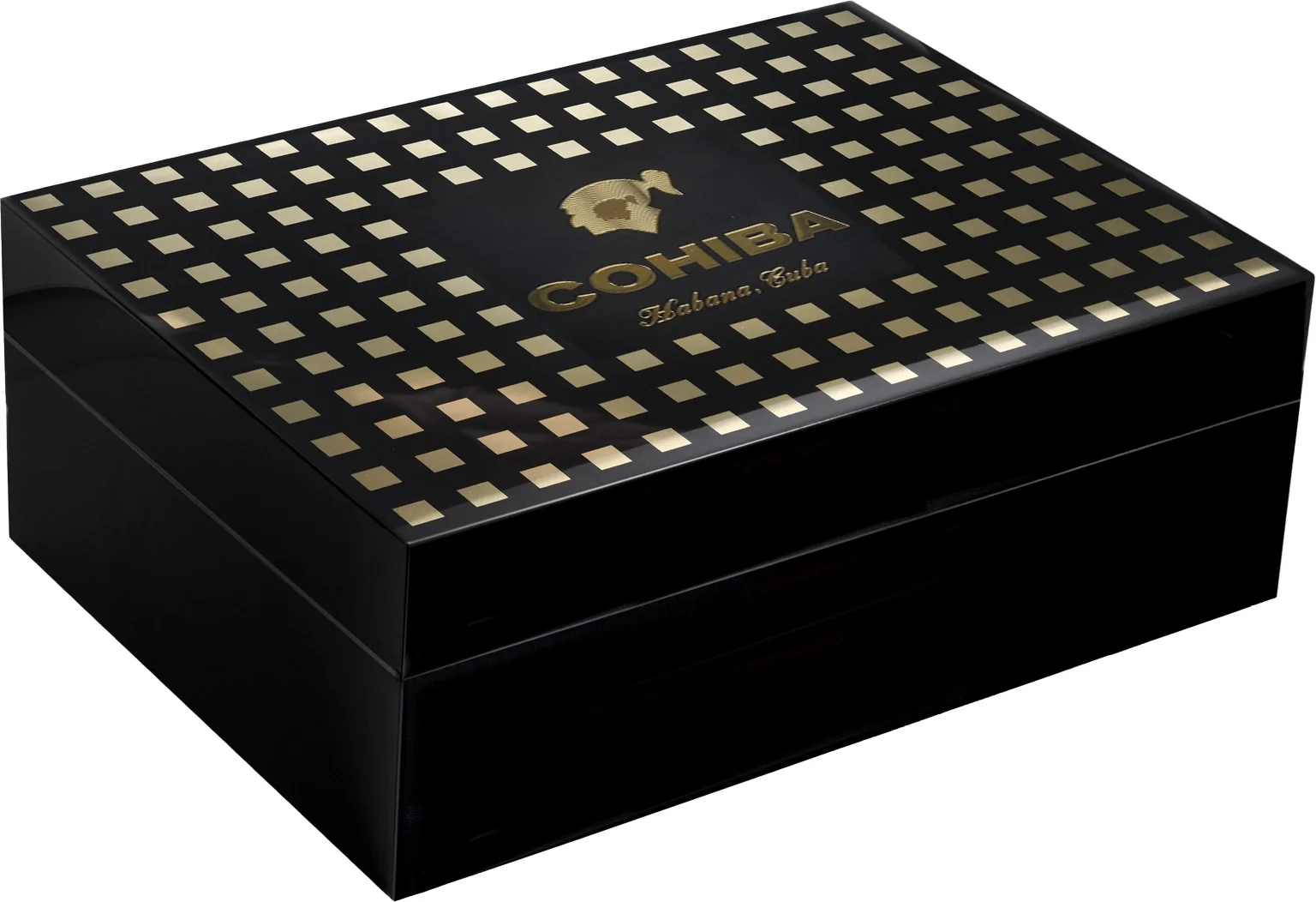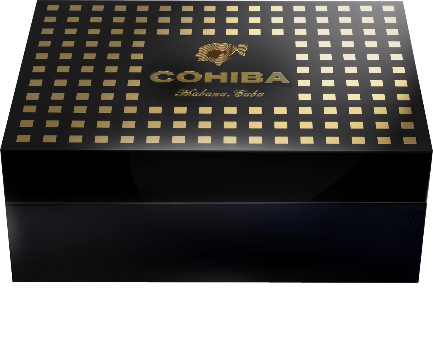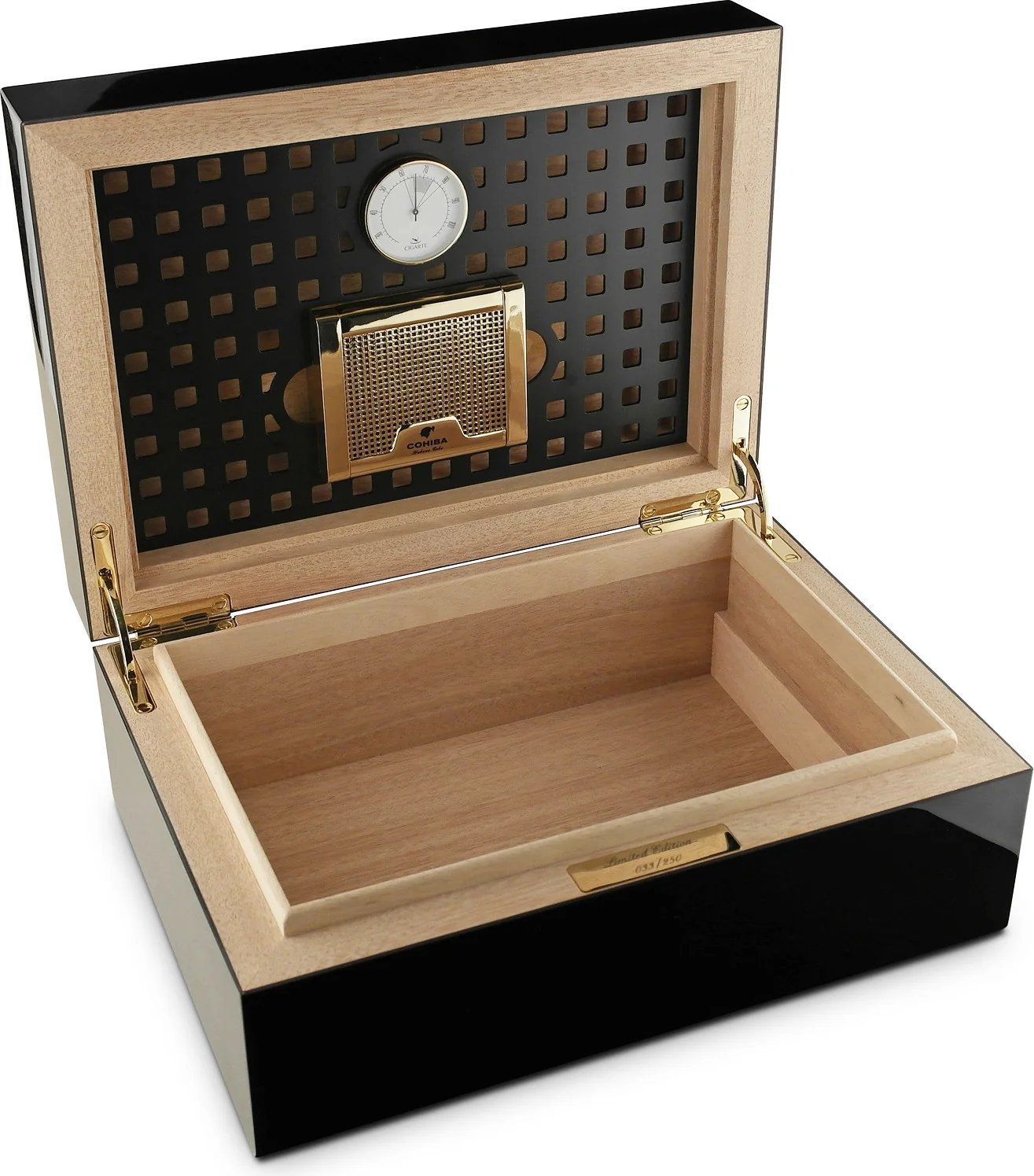 The humidor features a high-gloss black finish reminiscent of fine piano lacquer. Traditional gold elements add elegant accents. The famous Cohiba logo is prominently displayed on the lid. Upon opening, high-quality gold hinges and a plaque indicating the individual limited edition number are revealed.
