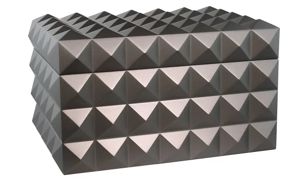 Colibri Humidor Grand Quasar grå Colibri Humidor Grand Quasar er en exceptionel humidor fra den berømte Quasar-serie. Dens futuristiske, tredimensionelle design med pyramideformede forhøjninger gør den til et absolut blikfang og adskiller den fra klassiske humidorer. Med sin unikke stil kombinerer den innovation og elegance og er derfor et højdepunkt for kræsne cigarelskere. Humidoren tilbyder en estimeret kapacitet på ca. 150-175 cigarer. Selv mindre cigaræsker kan sagtens passe her. Interiøret er smart opdelt: Et aftageligt lagdelt stativ med riller gør det muligt at opbevare individuelle cigarer og sikrer samtidig optimal luftcirkulation i det nederste område. Den har også en fleksibel lodret skillevæg for bedre organisering. Det nederste interiør indeholder endnu en fleksibel skillevæg, så opbevaringspladsen kan tilpasses. Leveringen inkluderer en passiv befugter og et digitalt hygrometer, som giver mulighed for præcis kontrol af fugtigheden. Det nødvendige batteri er allerede inkluderet. Gulvet i humidoren er dækket med blødt fløjl for at beskytte dine møbler mod ridser. Grand Quasar leveres i højkvalitetsemballage, hvilket også gør den til en ideel gave. Tekniske detaljer: