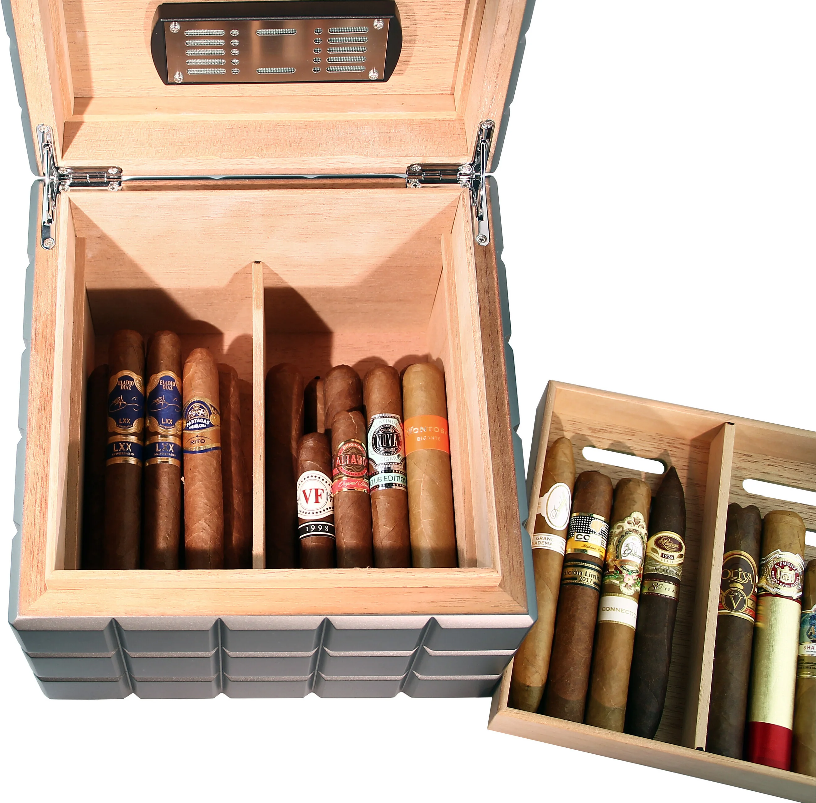 Colibri Humidor Heritage Cube antracitgrå Denne moderne, futuristiske kubehumidor fra Colibri-mærket imponerer med sit geometriske design og sin elegante antracitgrå farve. Et absolut blikfang, der tilføjer stil og elegance til ethvert miljø. Humidoren har plads til omkring 60 cigarer og imponerer med sin gennemtænkte indretning. Interiøret er opdelt i to områder: et aftageligt niveau til opbevaring af individuelle cigarer, som er udstyret med en fleksibel lodret skillevæg for bedre organisering. Mindre cigaræsker kan også opbevares i det nederste område, understøttet af en anden fleksibelt placerbar skillevæg. Det medfølgende digitale hygrometer med knapcellebatteri (allerede inkluderet) muliggør præcis kontrol af luftfugtigheden. Tilbehøret suppleres af en passiv luftfugter. Begge komponenter kan fastgøres fleksibelt til låget på humidoren ved hjælp af magnetiske hjælpemidler. For yderligere beskyttelse af dine møbler er bunden af humidoren dækket med blødt fløjl. De sølvfarvede hængsler i interiøret giver humidoren en elegant finish. Takket være den repræsentative emballage er denne humidor også ideel som en speciel gave. Tekniske detaljer: