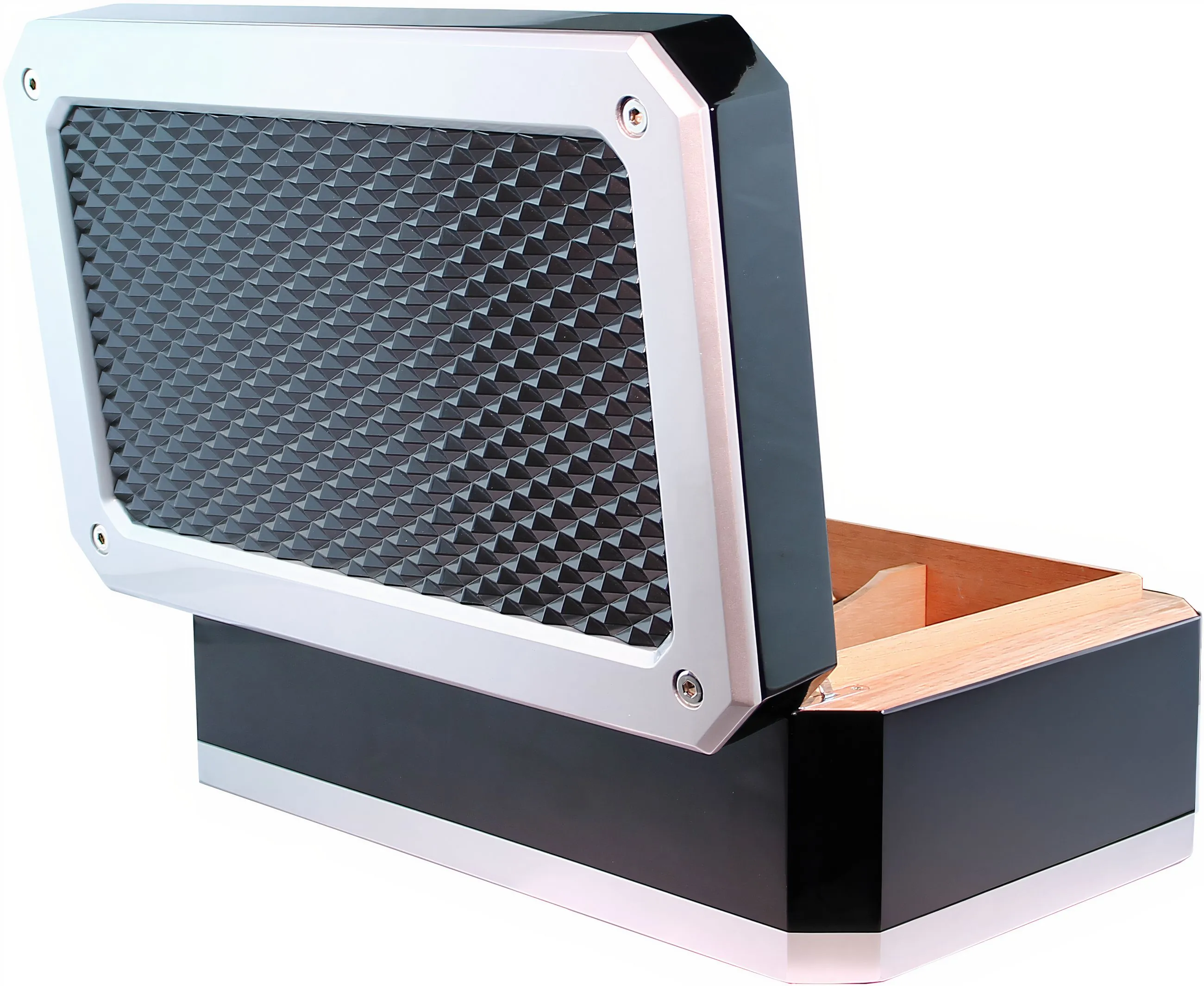 Colibri Humidor Rally sort og sølv Colibri Humidor Rally er en hyldest til bilindustriens design og kombinerer moderne æstetik med teknisk sofistikering. Kombinationen af blanke sorte og sølvfarvede accenter giver den et ædelt, dynamisk udseende, mens dens flade kanter skaber et futuristisk look. Lågets tredimensionelle overflade suppleres af solide, dekorative skruer i hjørnerne, og fronten af humidoren bærer stolt Colibri-logoet inklusive det år, hvor mærket blev grundlagt. Med en kapacitet på omkring 100-125 cigarer giver humidoren nok plads til din samling. Indvendigt sikrer to fleksibelt indsættelige eller aftagelige lodrette skillevægge optimal organisering. Det medfølgende digitale hygrometer muliggør præcis måling af luftfugtigheden, med det nødvendige knapcellebatteri allerede inkluderet. Befugtning leveres af en passiv befugter, som er stilfuldt fastgjort til låget i en magnetisk træholder. De sølvfarvede blødt lukkende hængsler afrunder perfekt det overordnede udseende af høj kvalitet. Denne enestående humidor er ikke kun et funktionelt opbevaringssystem, men også et ægte designstatement for elskere af motorsport og elegant æstetik. Takket være dens repræsentative emballage er den også ideel som en eksklusiv gave. Tekniske detaljer: