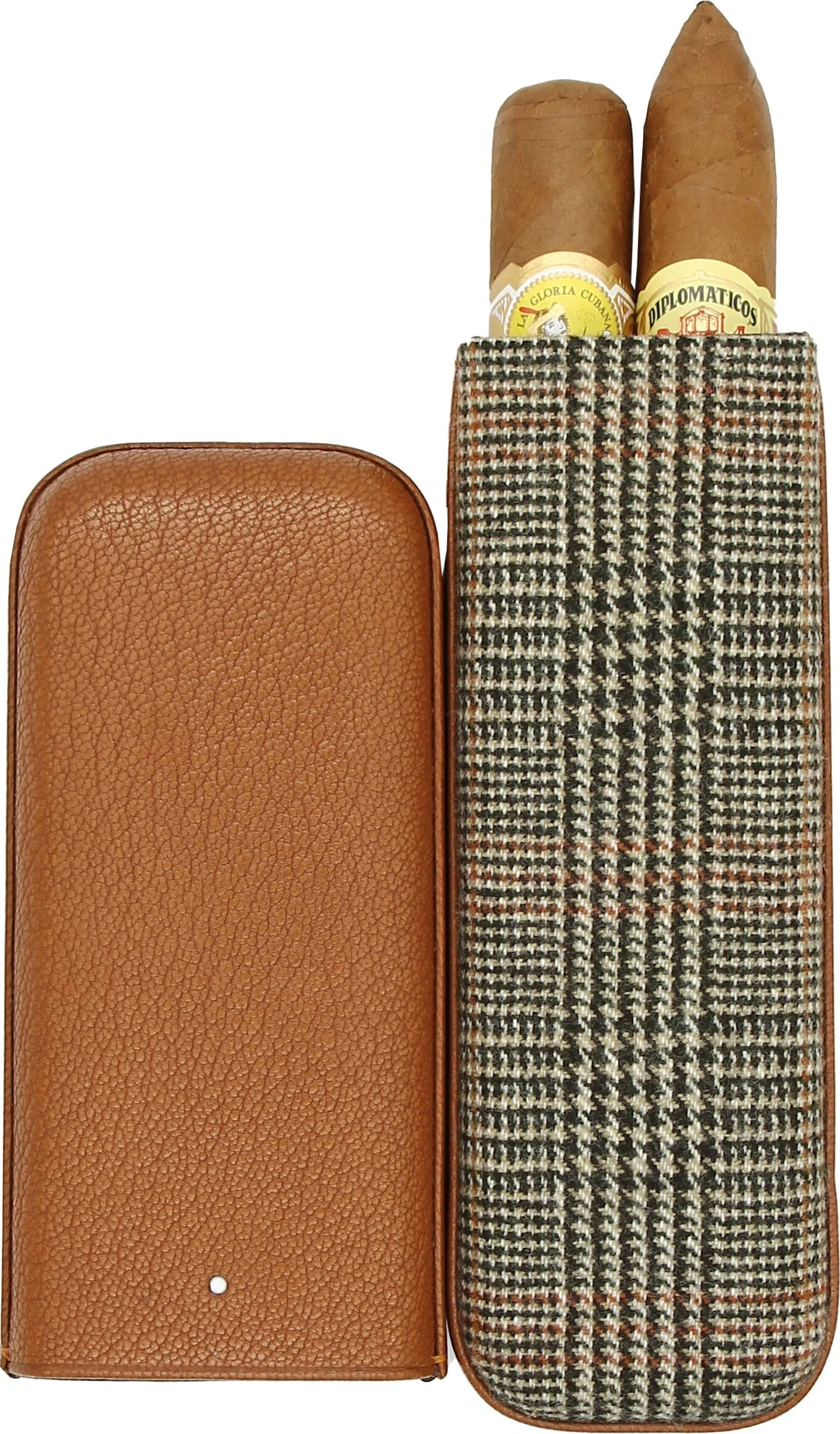Made in England, the case offers space for two cigars. The interior is lined with aubergine-colored leather, giving the look a special refinement.