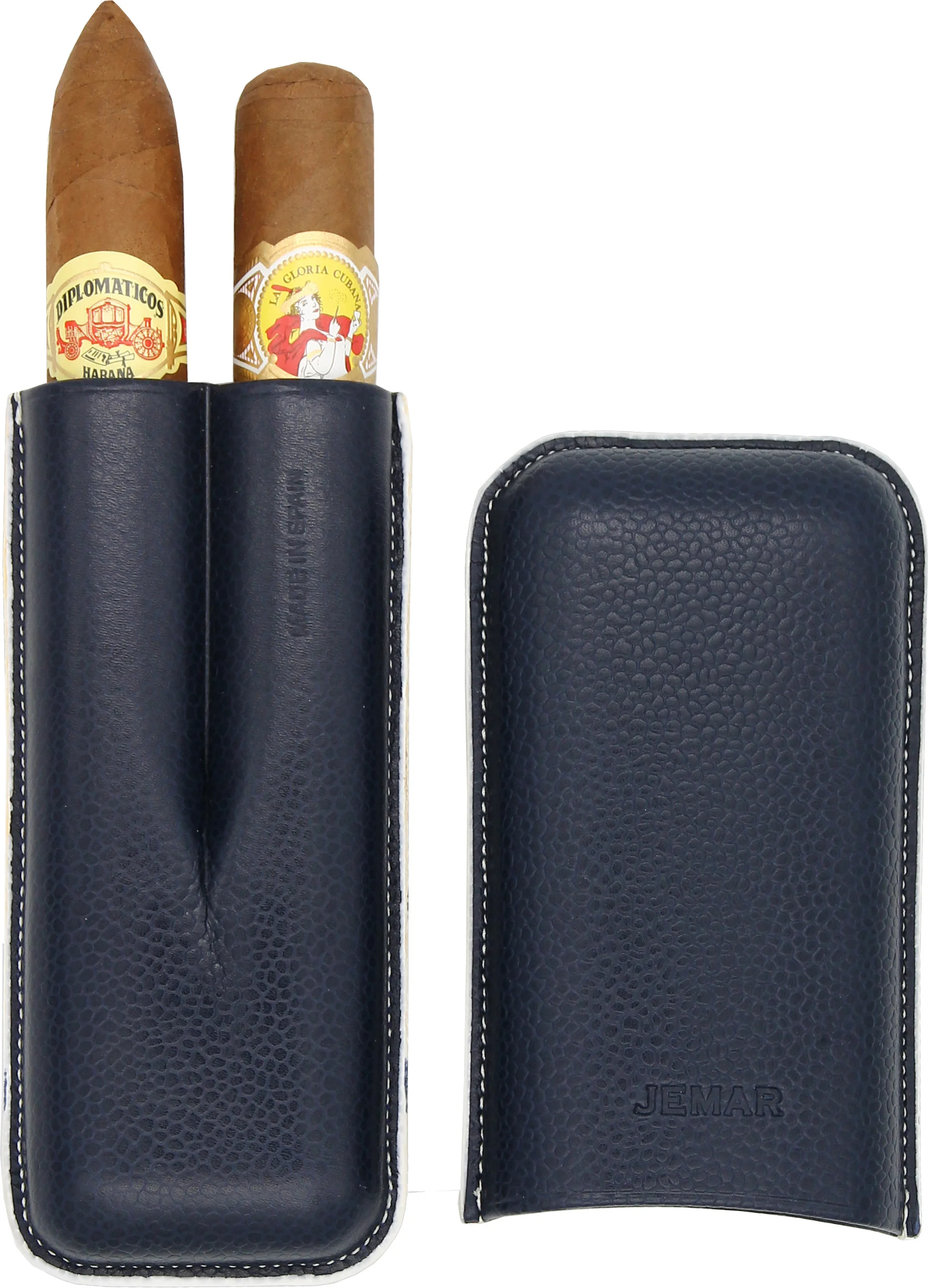 Jemar læder cigaretui til to cigarer er et stilfuldt tilbehør til entusiaster, der værdsætter kvalitet og håndværk. Fremstillet af ægte læder i en tidløs blå nuance med lette dekorative syninger og en hvid dekorativ kant, imponerer det med sin elegance og funktionalitet. Indvendigt er etuien foret med let, glat læder, som ikke kun skaber et sofistikeret udseende, men også giver ekstra beskyttelse til cigarerne.