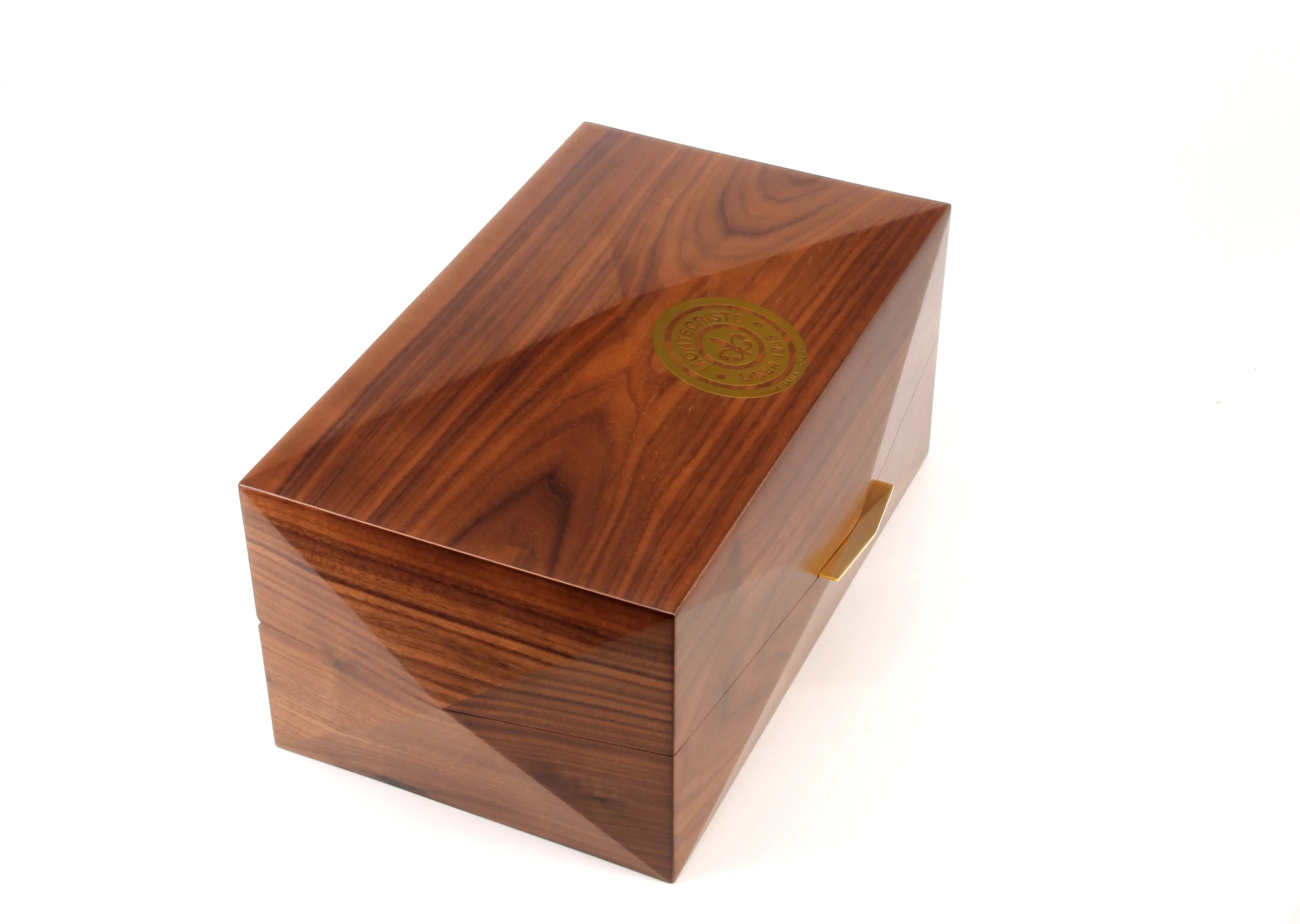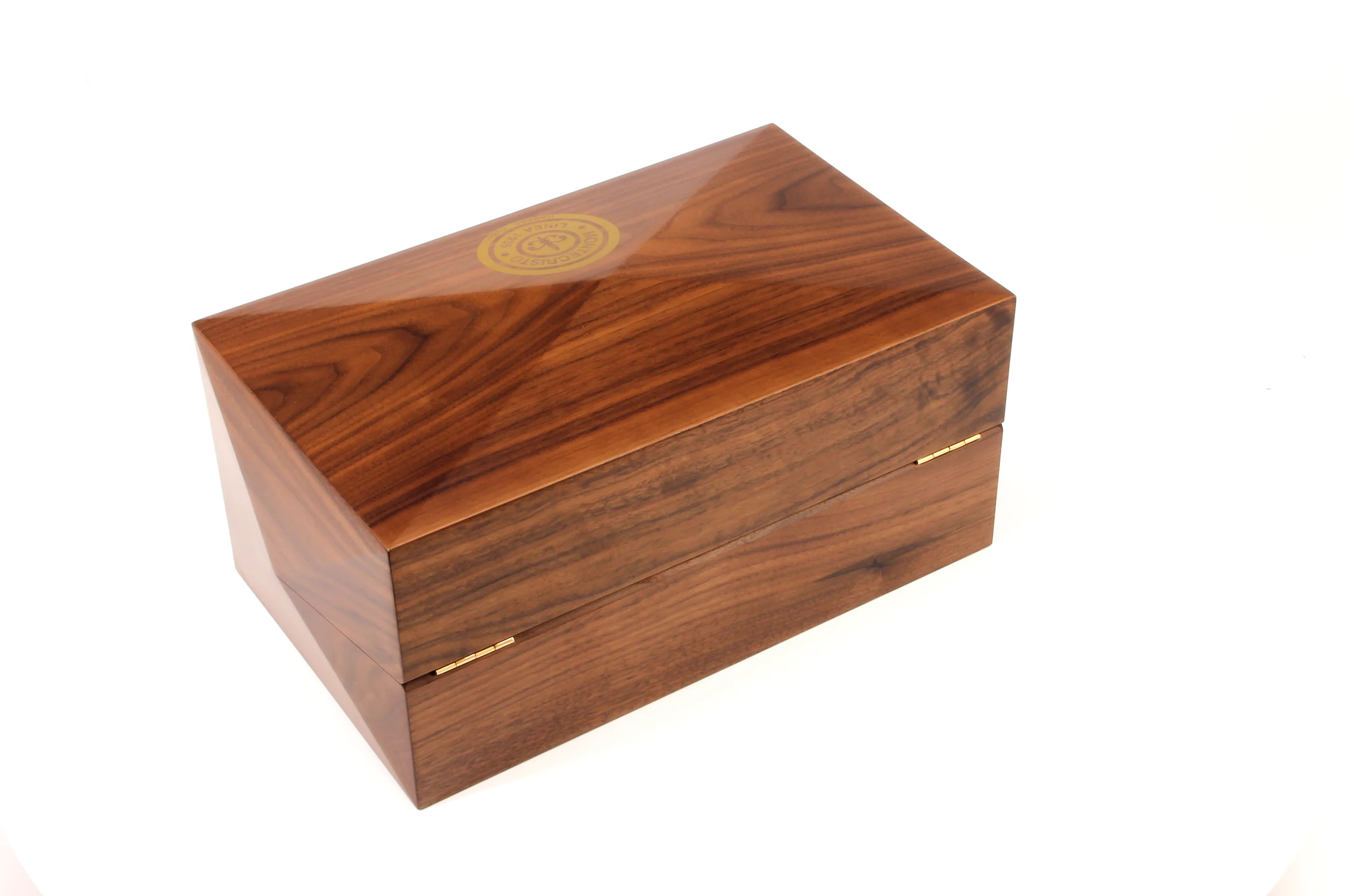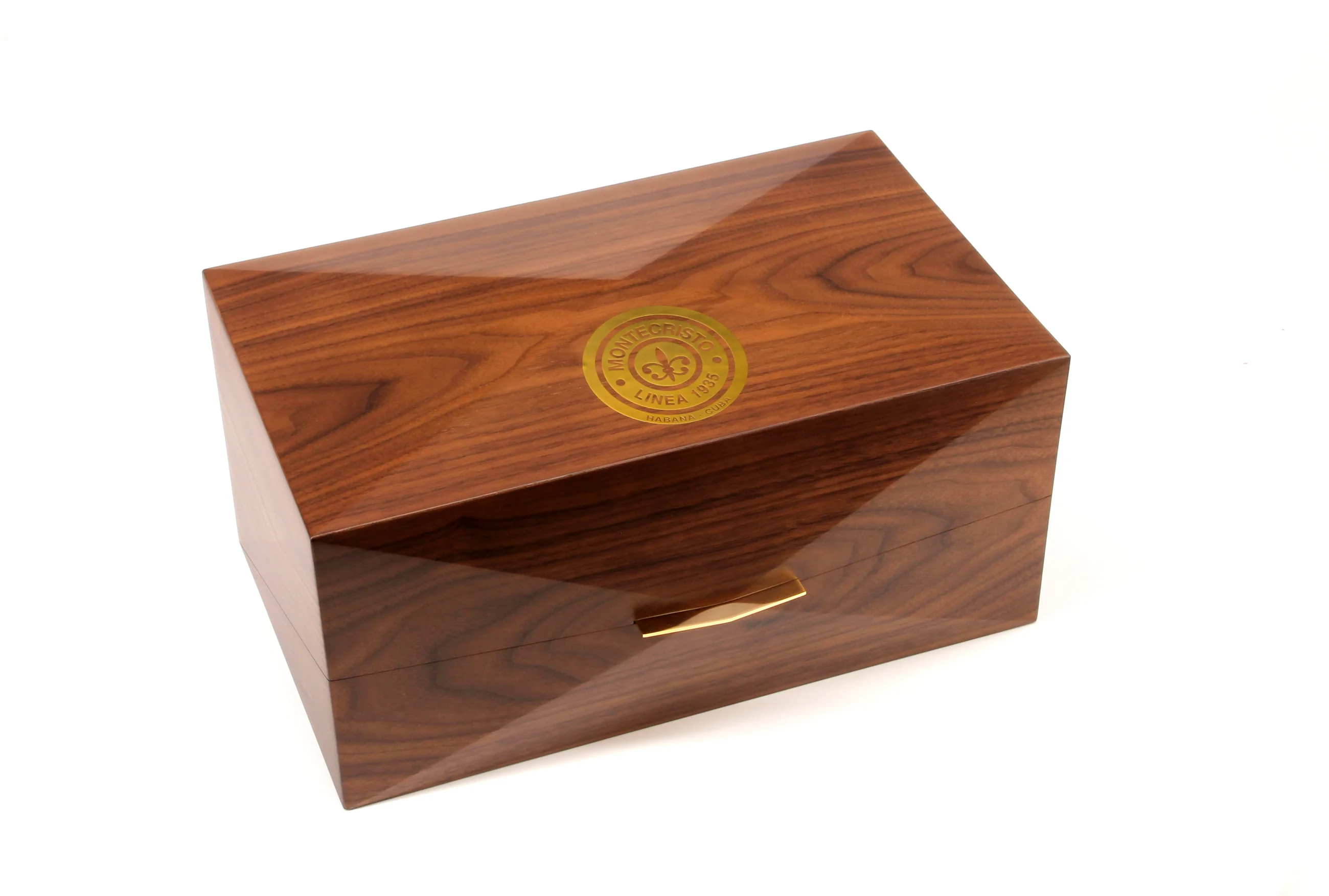 - Høj kvalitet og kunstfærdigt udført humidor i nuancer af brun, med guldbeslag og gyldent Montecristo Linea 1935 logo