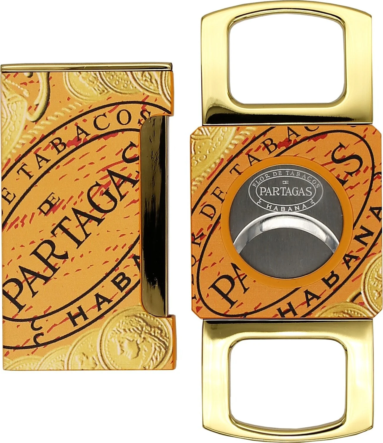 This Partagás lighter and cigar cutter set combines two high-quality accessories from the renowned Cuban cigar brand Partagás. Both pieces of the set feature the distinctive Partagás logo in vibrant orange and the brand's signature design motif on both sides, creating a distinctive and iconic look. The orange Partagás logo is complemented by shining gold accents, giving both the lighter and cutter an exclusive appearance. The interplay of vibrant orange, gold, and high-quality craftsmanship makes this set an elegant and modern companion for every cigar aficionado. The lighter is a single-flame jet lighter, ideal for precisely lighting cigars. It is refillable, and the flame intensity can be adjusted using the plus/minus control on the base. The double-blade cigar cutter has angled stainless steel blades that allow for a clean and reliable cut of the cigar. One of the blades is additionally laser-engraved with the Partagás logo, further emphasizing the high-quality overall impression.