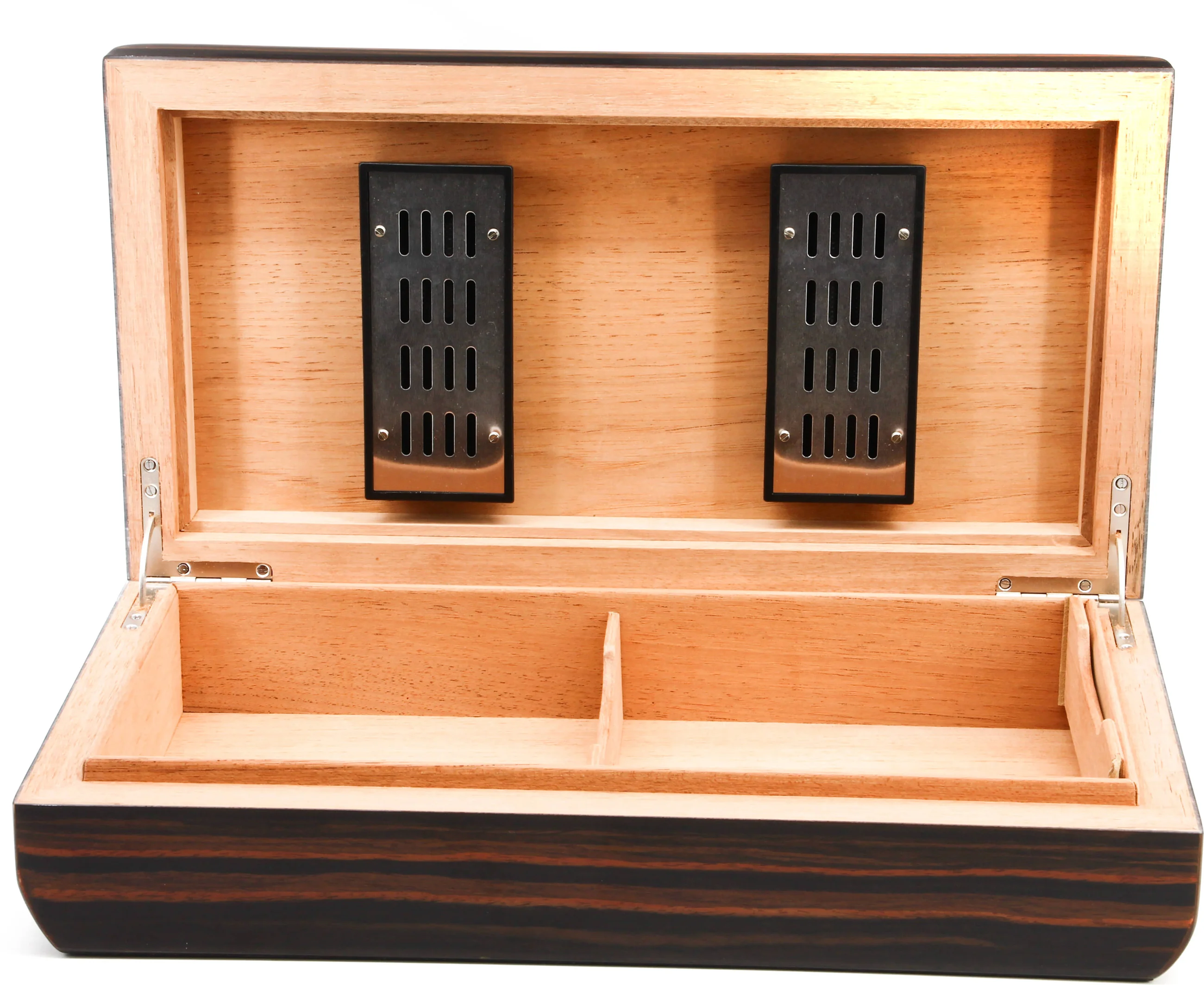 Pegasus Konvex Humidor Makassar Matte 80 er færdig med en tyk korpuskonstruktion og solidt byggede hængsler, og er en smukt udformet humidor, som du kan stole på, at dine cigarer holdes i førsteklasses stand og ubestridt stil i mange år fremover. Forkæl dig selv og dine cigarer med en Pegasus humidor.