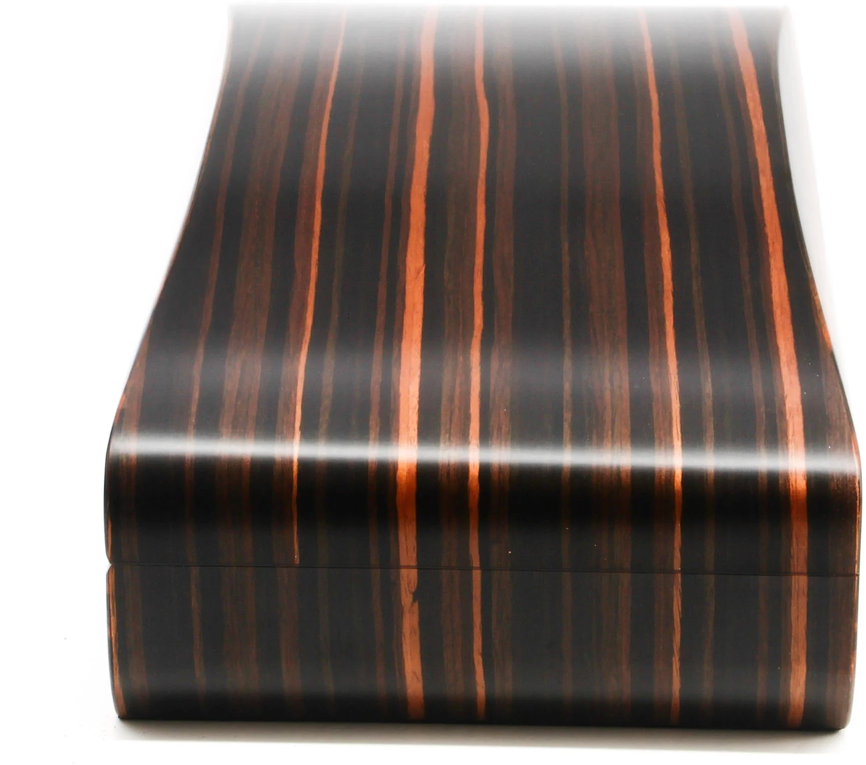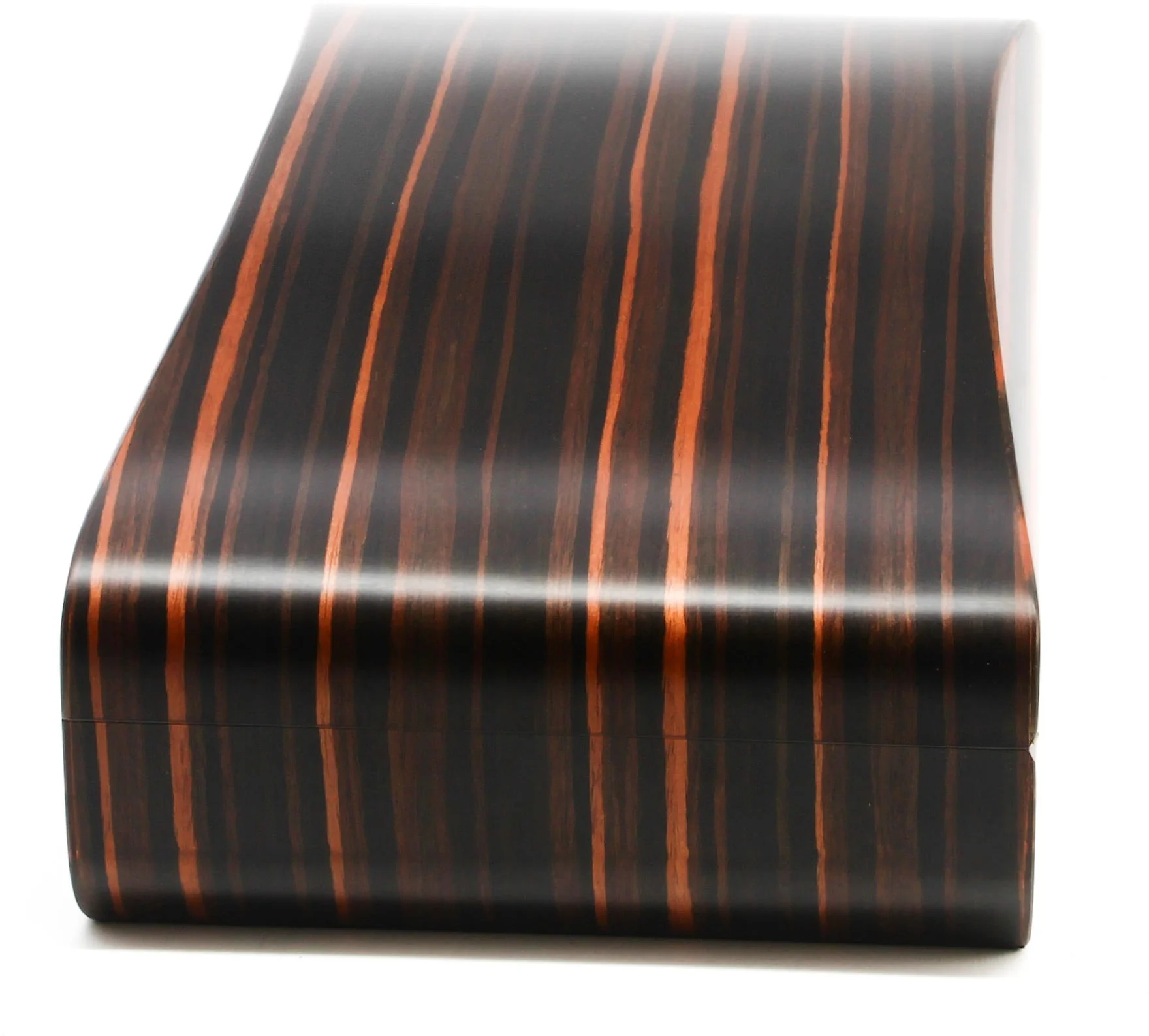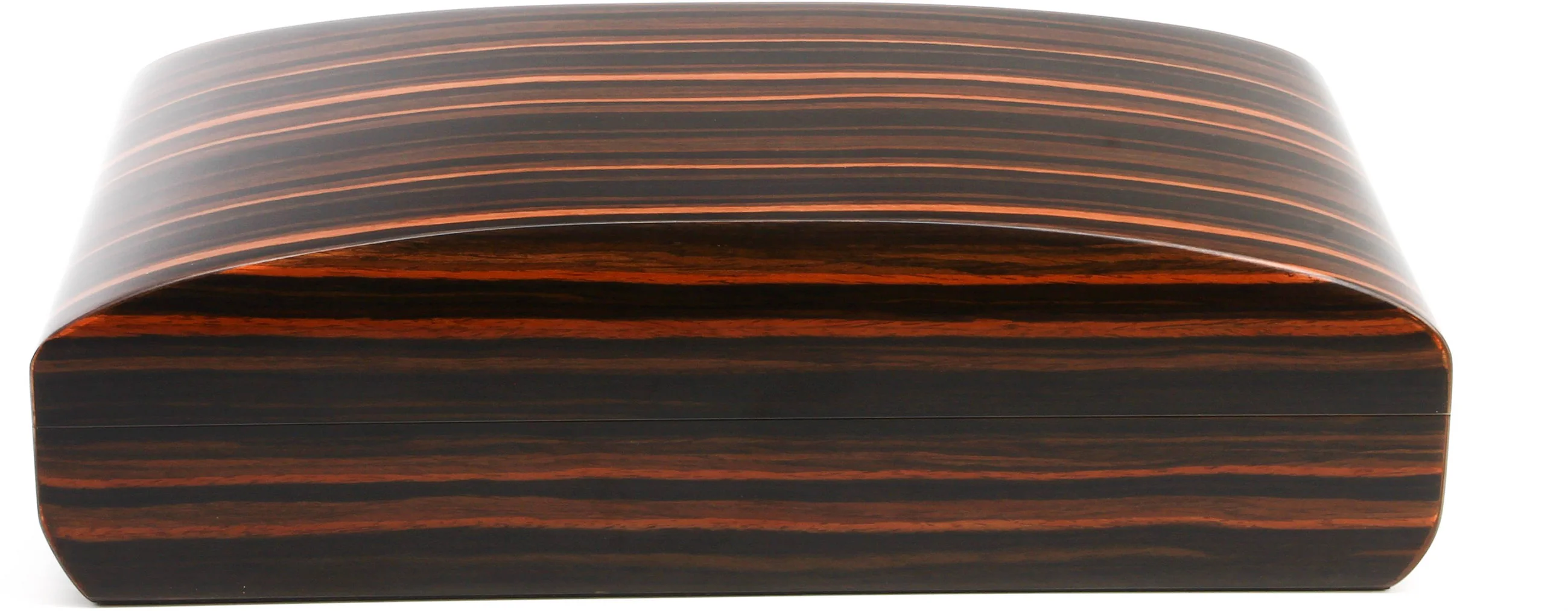Med sin aflange form og sensuelle kurver er dette fantastiske stykke langt fra din almindelige humidor. Det forførende makassarfinér begejstrer med brede streger af lyse og mørke trækorn, som smukt flyder over humidorenes sofistikerede ovale form.