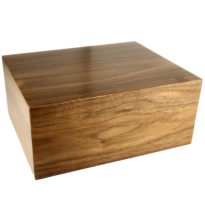 - **Attraktivt valnøddetræ:** Humidoren er lavet af smagfuldt valnøddetræ, der er matlakeret for at fremhæve dets naturlige skønhed.