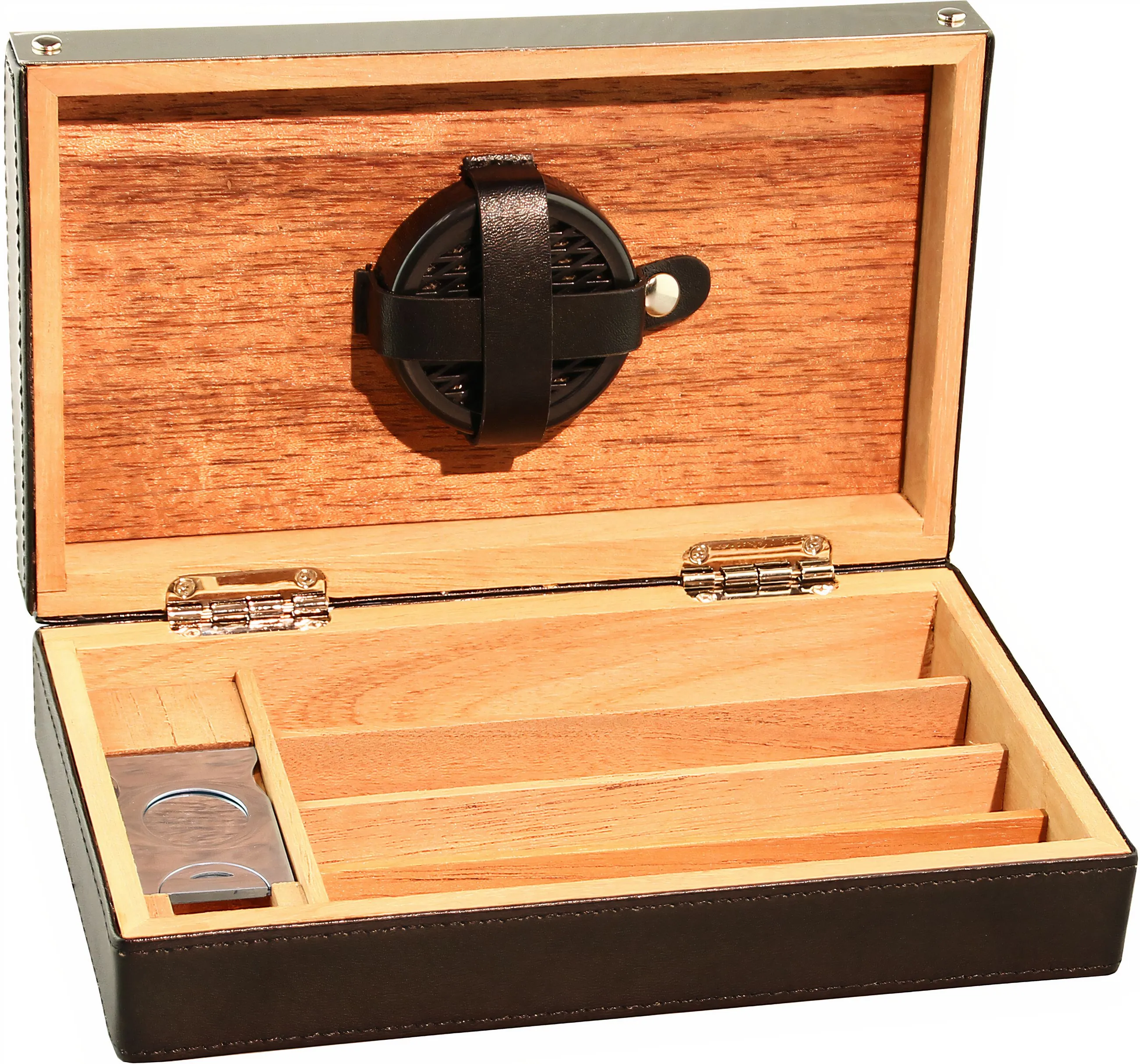 cedertræ. Sølvhængsler fortsætter det elegante design og opfanger harmonisk lågets kromelementer. En gennemtænkt og stilfuld løsning er den runde luftfugter, der er integreret i låget og fastgøres sikkert med en læderrem med tryklås. Fyldt med destilleret vand sikrer det, at dine cigarer opbevares perfekt på farten eller derhjemme.