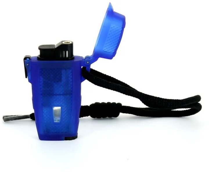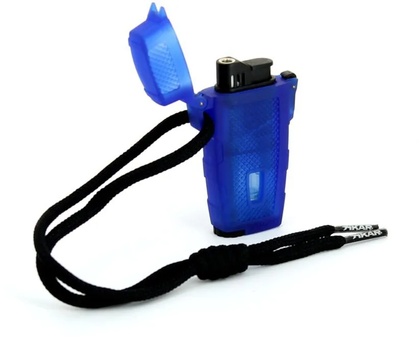 Xikar lighter model Stratosphere i blå. Denne stormsikre udendørs lighter med turboflamme består af en gummikrop og har en let synlig niveauindikator.